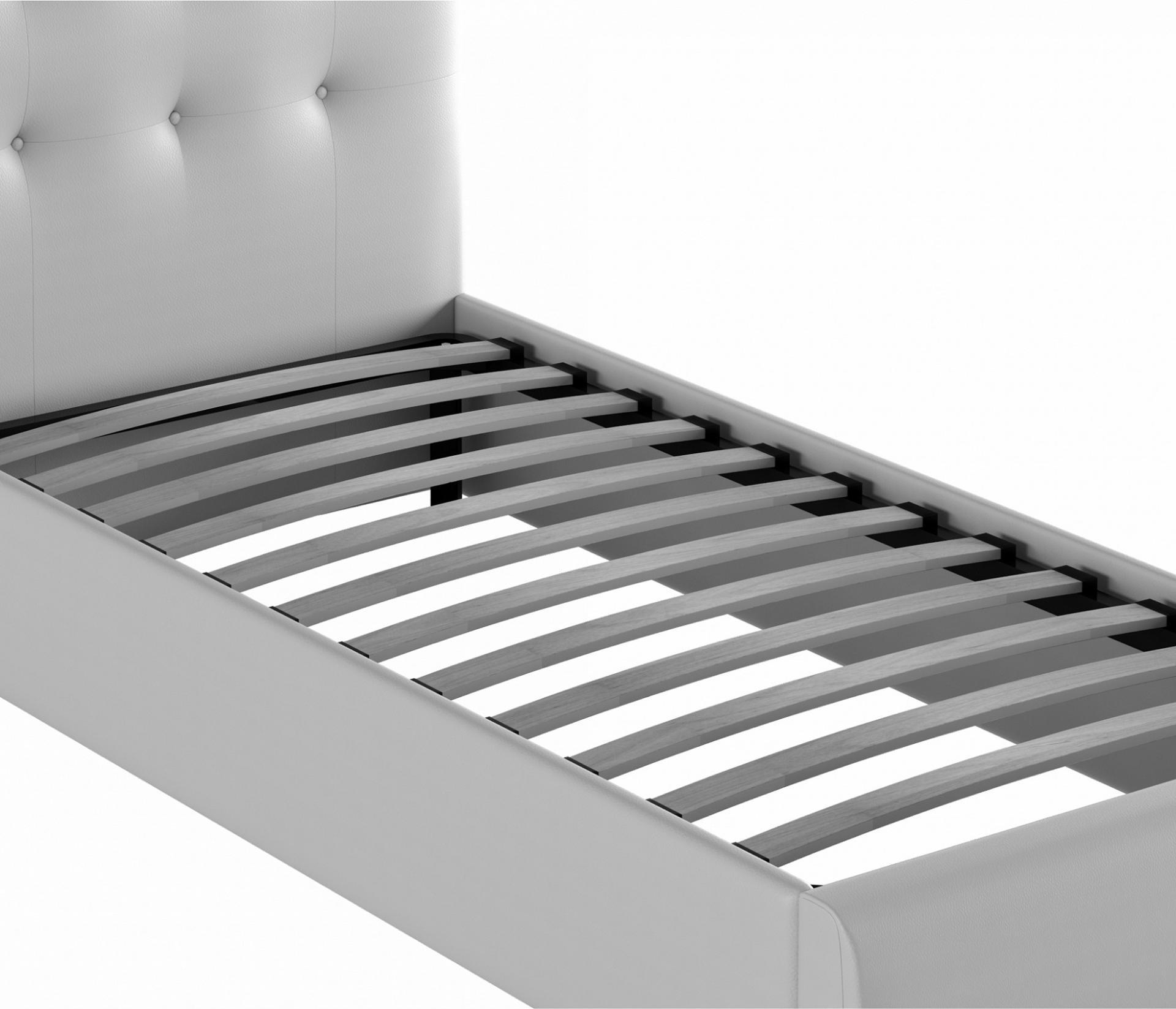 Интерьерная кровать-тахта имеет усиленное металлическое основание с амортизирующими ортопедическими ламелями.