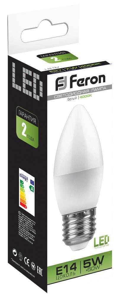Лампа светодиодная FERON LB-72, C37 (свеча), 5W 230V E27 4000К (белый), рассеиватель матовый белый, 420Lm, угол рассеивания 200°, корпус пластик, 100*37мм