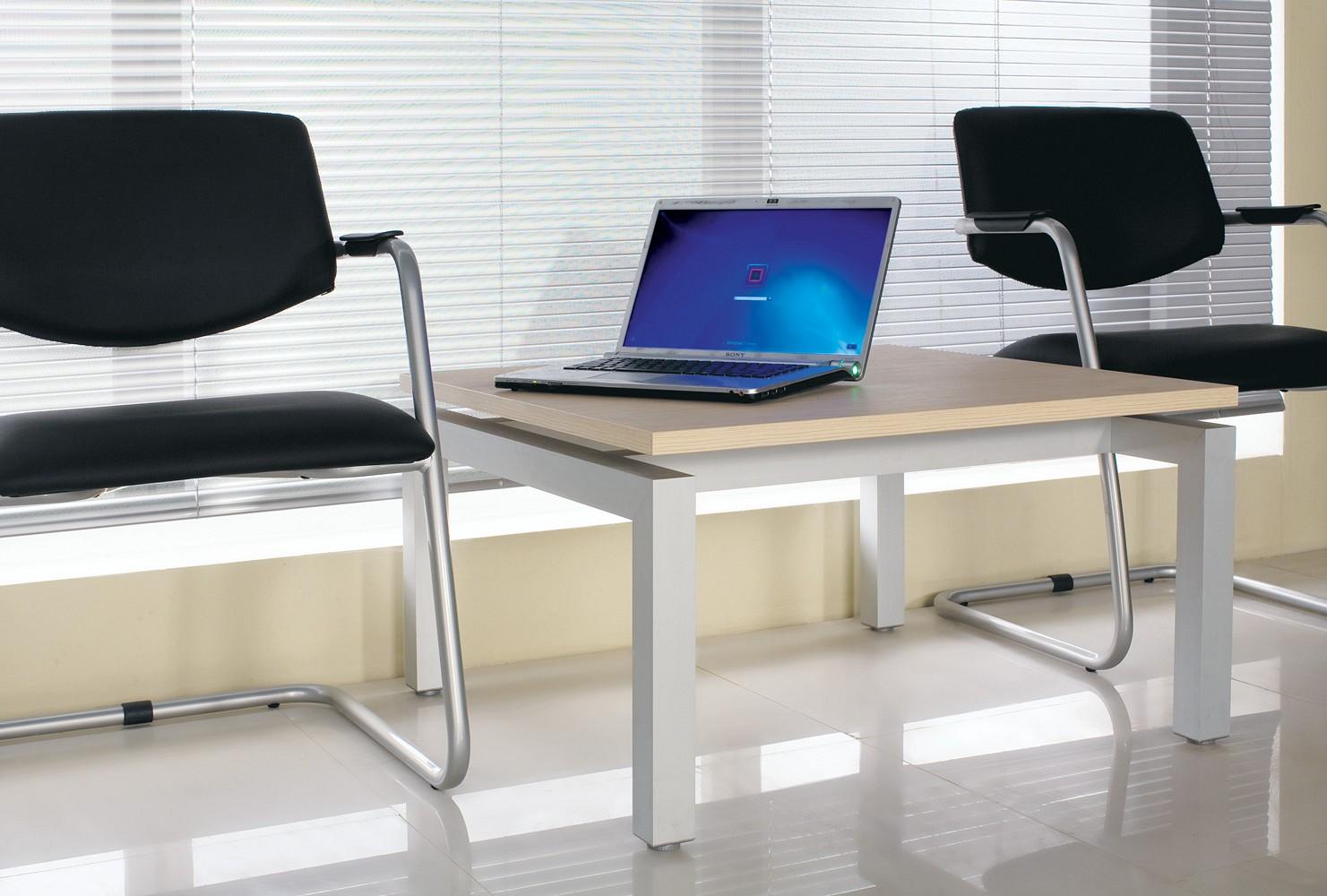 Стол состоит из металлического каркаса и столешницы. Внизу опоры установлены металлические регулируемые винты, что позволяет компенсировать неровности пола до 10 мм.